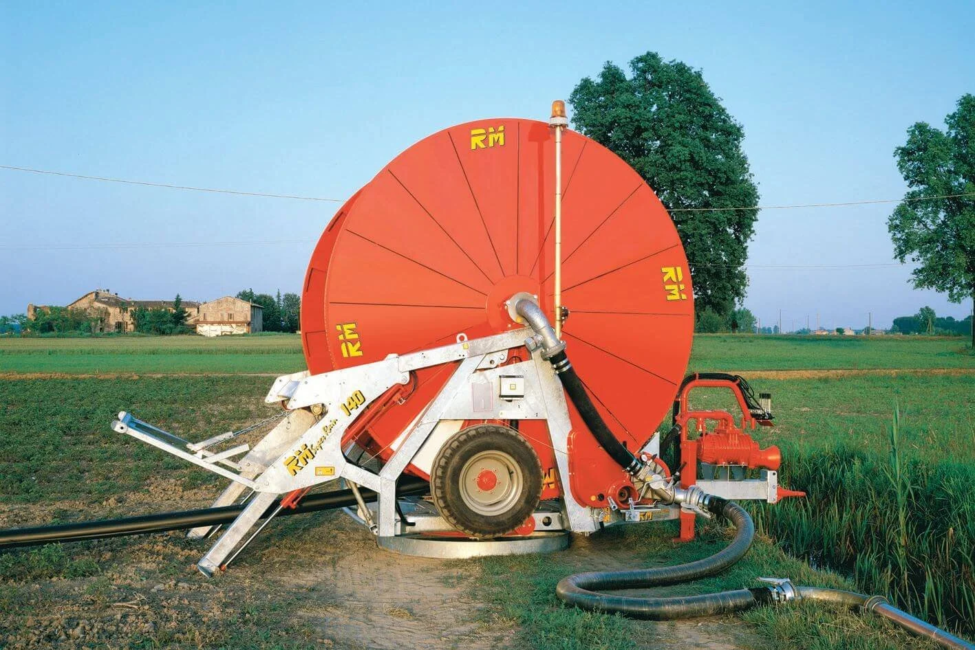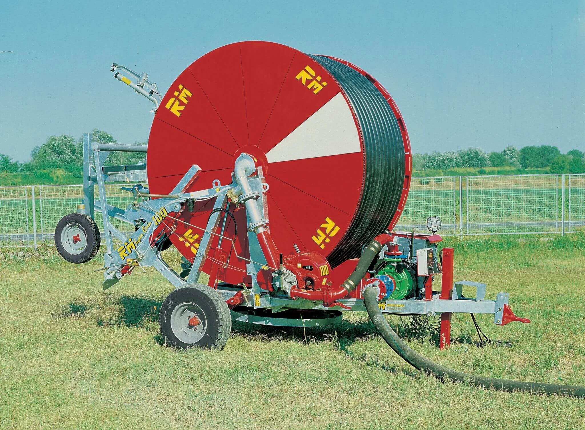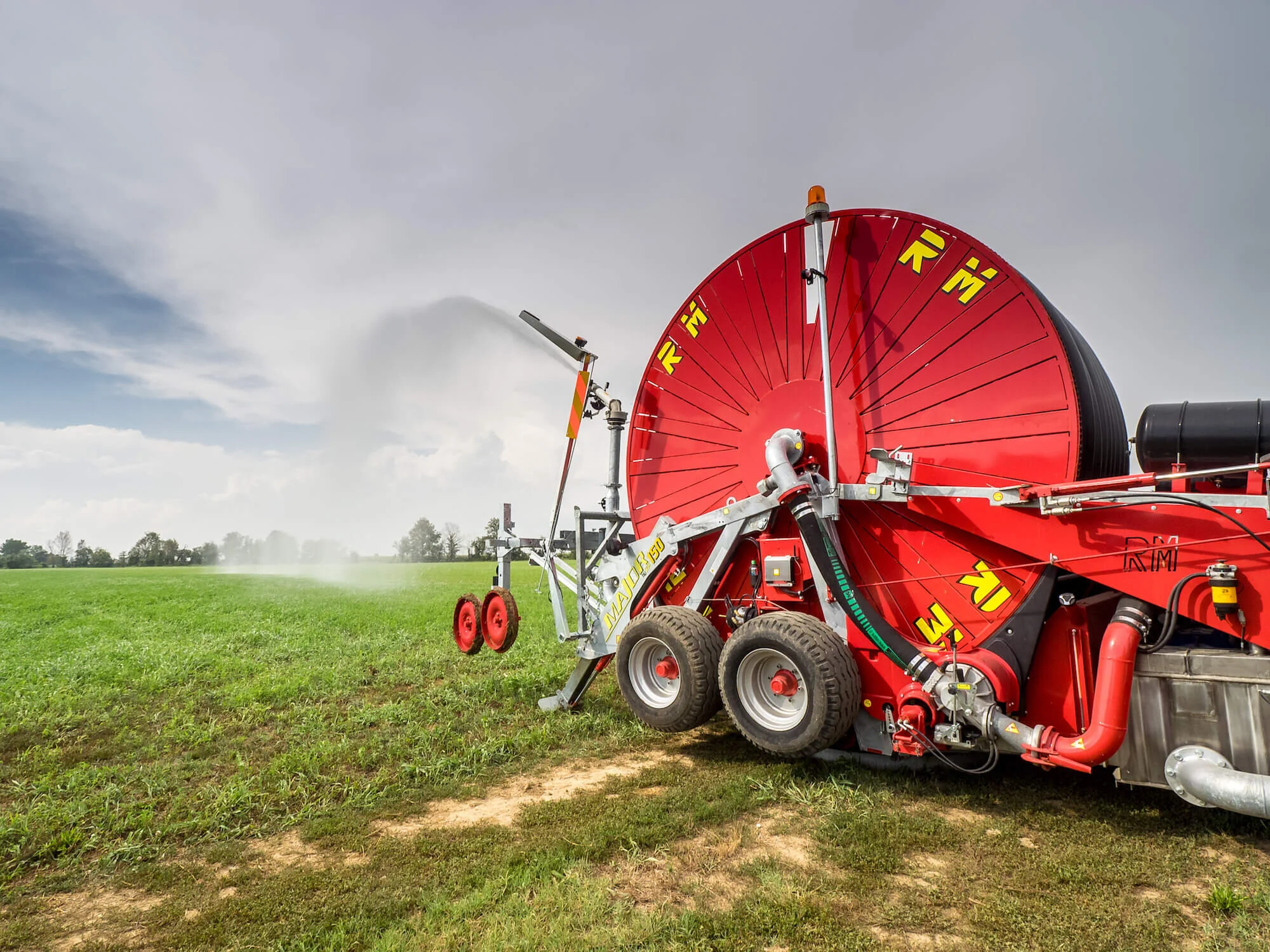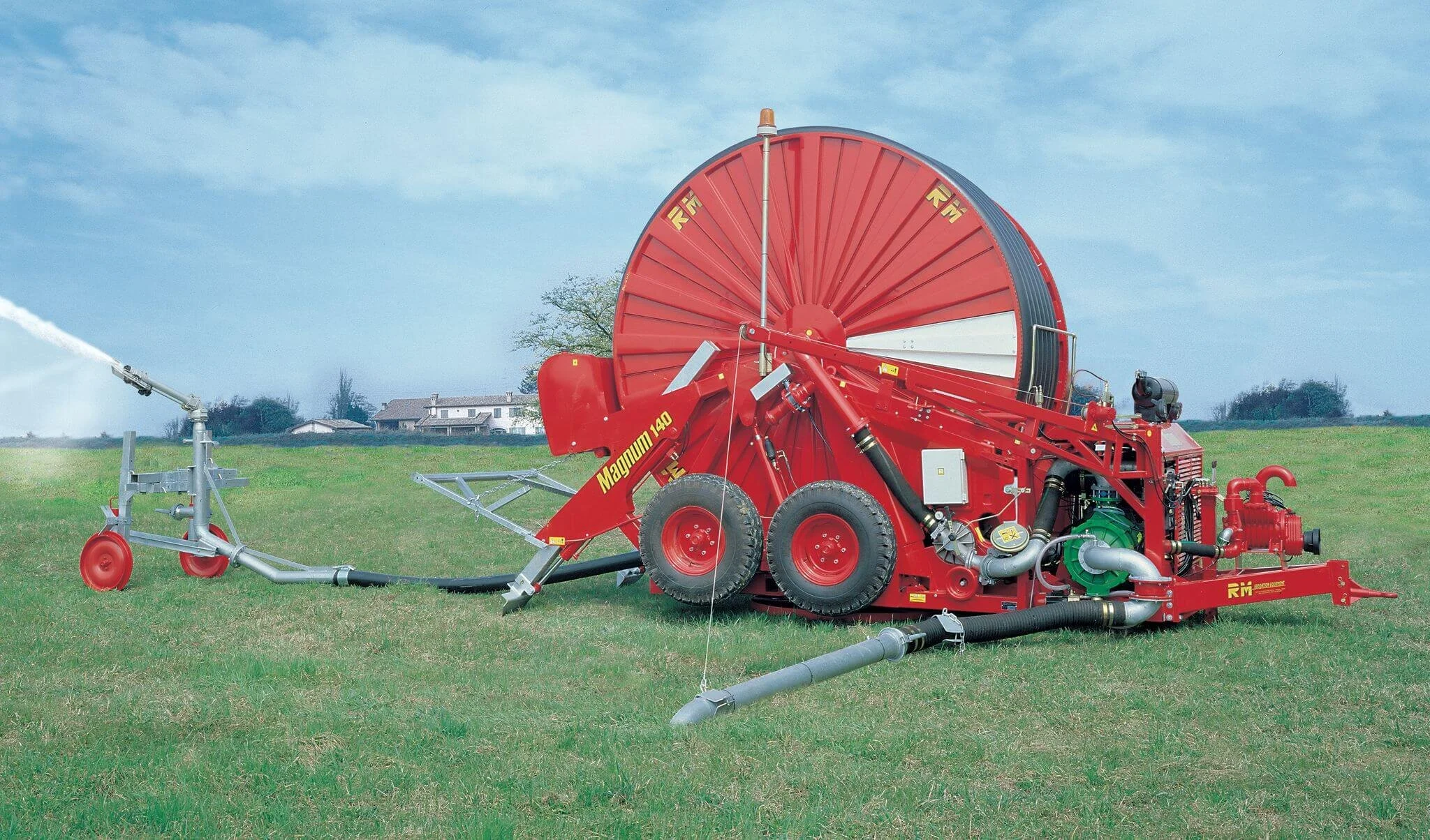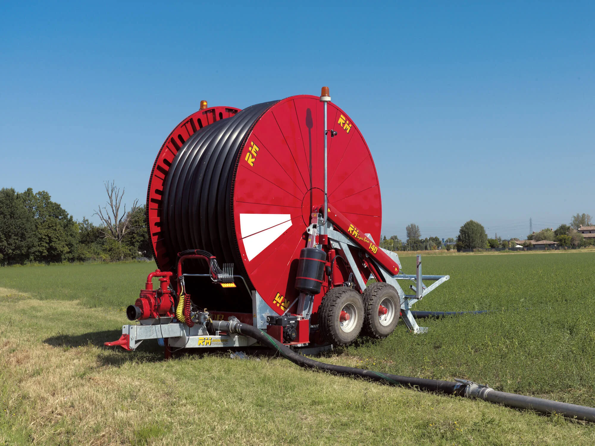 The XJ range of RM hard hose irrigators offers greater stability and greater efficiency. The XJ machines have the added features of Automatic Vertilift, a belly plate and hydraulic adjustable wheels. The Automatic Vertilift lifts the gun trolley towards the hose reel at the end of the run, while keeping the gun level, allowing the machine to water to the very end of the run without causing crop damage. The belly plate and hydraulic wheels give the machine greater stability on steep slopes and rough terrain.